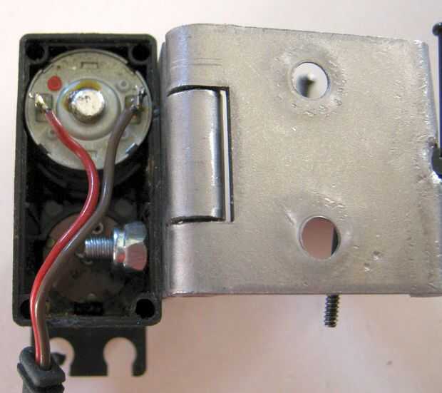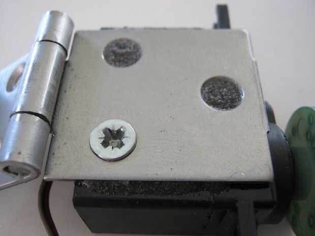 - Una bisagra es alineada con el servo y el marco y pegada a la caja del servo.
