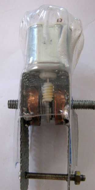 Este montaje consiste en un motor de un engranaje de gusano que está montado libremente en el marco de tubo cuadrado de aluminio para que un deslizamiento ajuste para acomodar cualquier fuera de redondo del anillo varilla roscada.