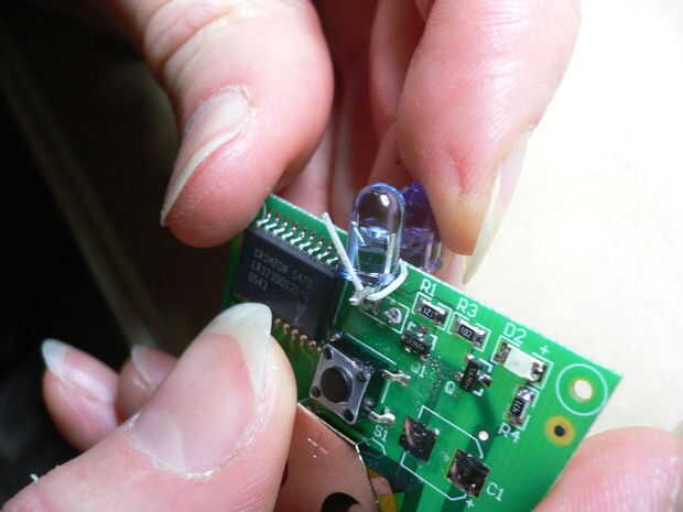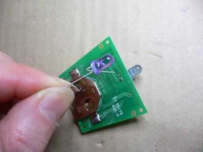 Empuje el cable negativo (uno que acaba doblado) en el cojín de vacío del emisor sobre el PCB y lo de la soldadura. Asegúrese de soldadura en el lado opuesto de la PCB de la original emisor de IR. (Ver foto 3).