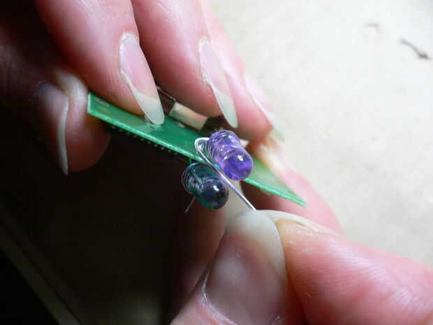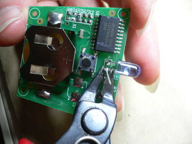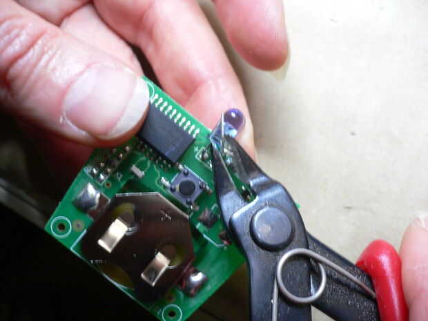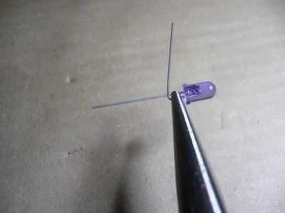 Doble hacia arriba el cable negativo (el cable más corto) del emisor de IR como se muestra en la foto 2. Debe haber aproximadamente 1/8" de plomo asomando desde el emisor antes de la curva (como se puede ver en la foto 2).