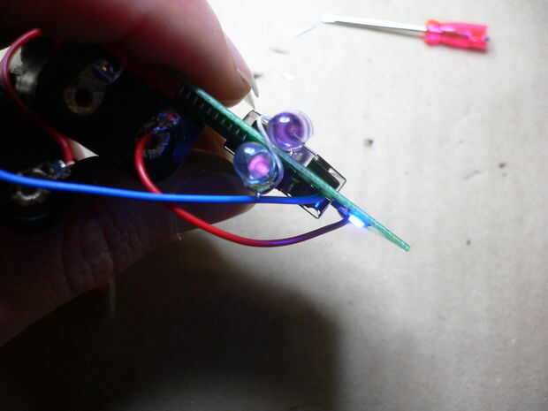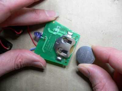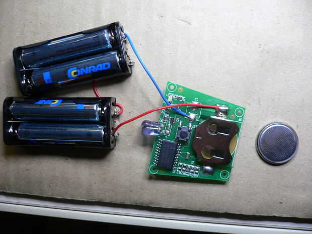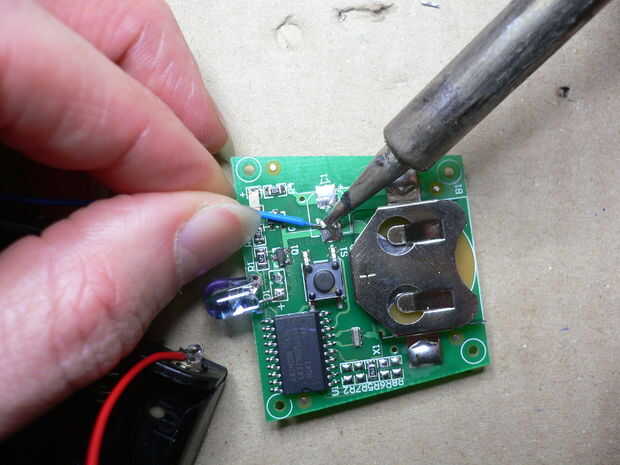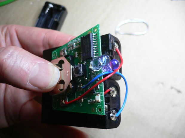 Tan pronto como se inserta la celda de moneda en B2, visible en la placa se parpadeará el LED (ver foto 5), 6 veces para la base de datos europea, o 3 veces para la base de datos de América del norte (véase el paso 9 para cambiar entre bases de datos europeas y norteamericanas). Si no parpadea, entonces hay probablemente algo mal con la tensión de los nuevos titulares de batería que ha agregado (véase el siguiente paso, Step 7, para prueba y depuración de consejos).
