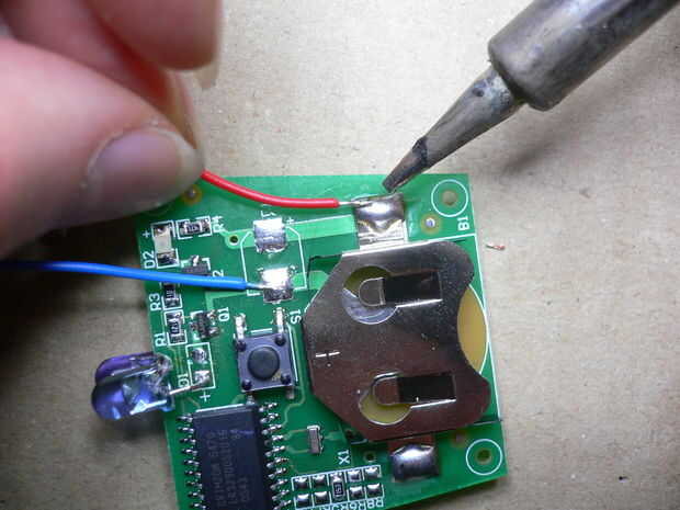 Solde el cable positivo (yo usé rojo) desde el portapilas a la almohadilla en el PCB mostrado en la foto 2.