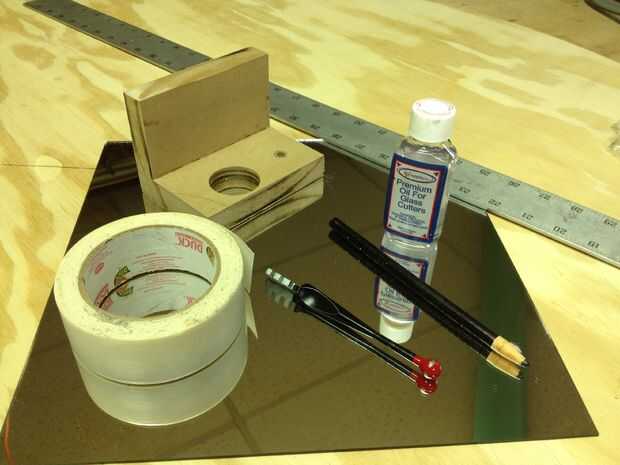 Básicamente lo que necesita para hacer la guía es 2 bloques de madera, 2 espejos y medio les pegadas.  En mi caso, usé cinta dobles del palillo de la alfombra.  Si no tienes 2 espejos pequeños, usted también necesitará un kit de corte de vidrio y un borde recto.