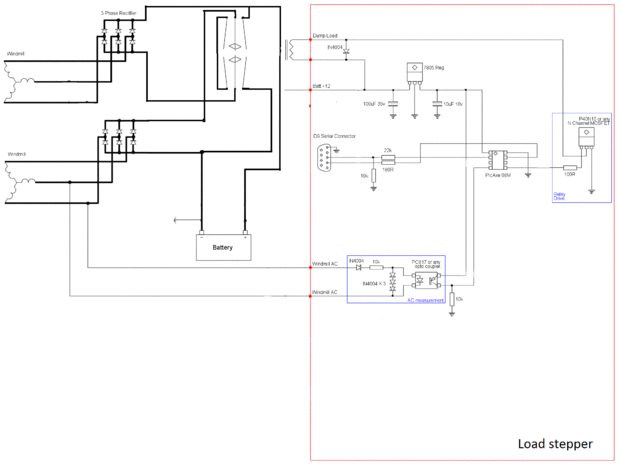 La electrónica armé todo yo mismo, los diseños para el controlador de carga son de http://www.mdpub.com/555Controller/index.html es un diseño muy simple pero funciona bien y cambiando la corriente nominal del relé, puede cambiar grandes cantidades de corriente. también incluí una bitácora para registrar todos los datos de mi turbina de viento, que el diseño fue de http://www.thebackshed.com/Windmill/PicLog.asp que esto fue muy divertido ya que incluye programación y fue una prueba de mi habilidad. el último componente electrónico de mi turbina eólica de fue un paso a paso de gen, diseñó y construyó este mismo que su función era cambiar los dos alternadores, en serie en baja del viento así que obtuve un baja velocidad de carga del viento y cuando el viento sería cambiar los dos alternadores en paralelo para dar capacidades corriente y carga máxima. Esto hizo que esta turbina muy eficiente. Los pasos del gen tenían que conectar con las rpm del generador porque la tensión fue fijada por las baterías y tenía que ser programables para que sea calibrado para conseguir que cambie en el mejor momento. Instructables para este proyecto se puede encontrar aquí