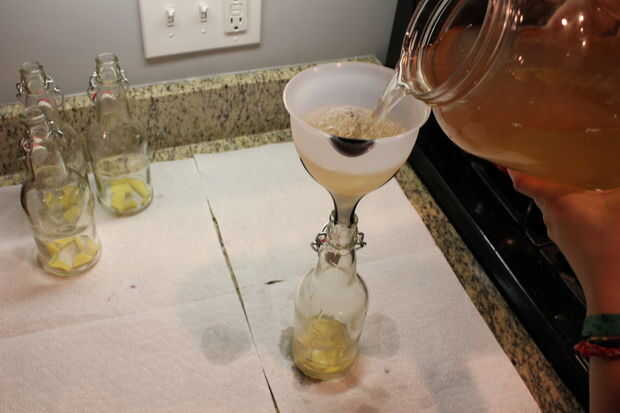 Usando el embudo y colador (usted puede conseguir un embudo del combo con un colador que encaje en pleno y esa cosa es un Dios!), verter el té en cada botella. Eche el agua lentamente para evitar el desbordamiento y vierta sobre el fregadero para evitar mayores derrames.