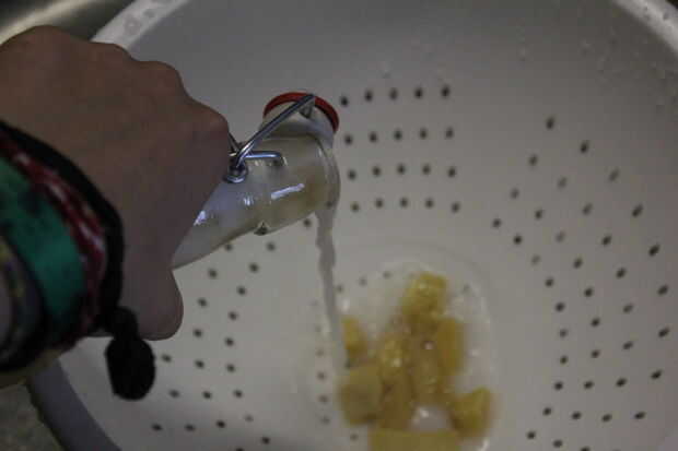 Después de 3-5 días, puede detener el proceso de doble fermentación. Para ello, simplemente refrena su té y viértalo en la botella. Acaba de poner un colador sobre un bol hacer este proceso.