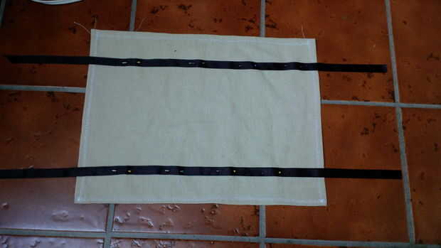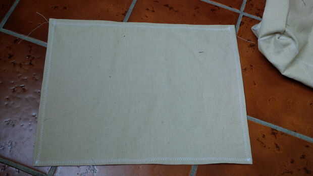 El dobladillo debajo de los bordes crudos en la pieza de aleta todo cortado anteriormente. Es simplemente un cuadrado, pero debe utilizar una puntada zig-zag o similar para controlar los bordes crudos y evitar deshilaches.