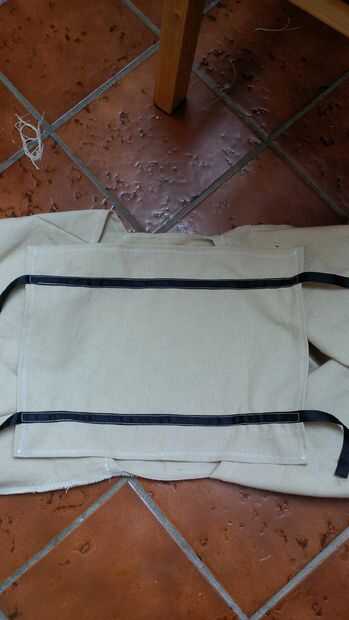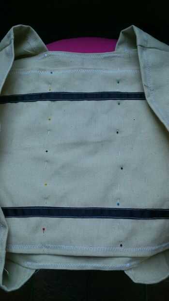 Colocar la pieza base, plano y centro de la pieza de aleta en la parte superior. Fijar firmemente la pieza va a ser bastante voluminosa por ahora y no quieres que se deslice. Ya planeo mi pinza con resorte a través de una brecha entre la pieza de aleta y la pieza base del hilo de rosca, solo cosí el largo camino donde los pines están en la foto, pero si usted se asociar diferentemente usted puede sentir libre cambiar. Usaba una puntada en zigzag para la fuerza adicional, pero que no queden crudas asperezas y esta puntada será visible, puede utilizar lo que usted está más cómodo con. Consejo: me pareció más fácil meter las solapas en las bolsas por lo que estarían fuera del camino mientras se cose.
