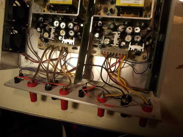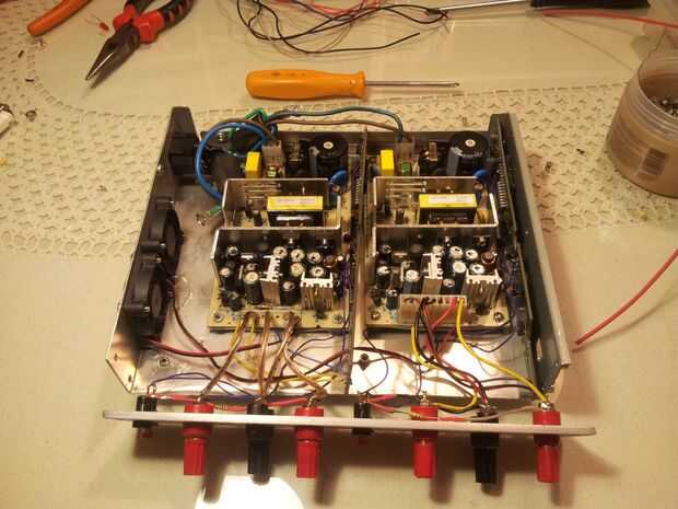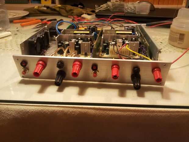 Poner dos fuentes de alimentación en la caja, tornillo abrazaderas para el papel de aluminio y conect salidas de las fuentes de alimentación diferentes a las abrazaderas.