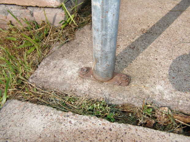 3) ahora tiempo de montaje de poste de. Mida la longitud entre el buje superior barra plana superficie a la superficie de hormigón más abajo. Reste el espesor del parte inferior del casquillo barra plana superficie + 3/16". Corte el poste de montaje metálica a la dimensión resultante. El Polo está listo para elevarse.