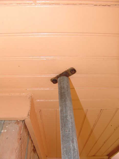 1) Marque el centro del Monte de buje giratorio superior. Se trata del mismo centro como el poste sí mismo. Coloque la línea central del buje sobre el este y marca de los pernos de centro de los dos agujeros que deben ser perforados para el lag. Taladrar los agujeros para los pernos y Monte el casquillo superior atornillando los dos tirafondos.