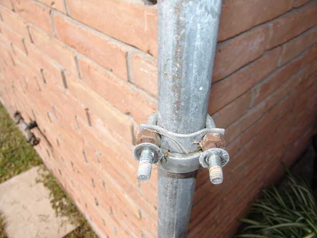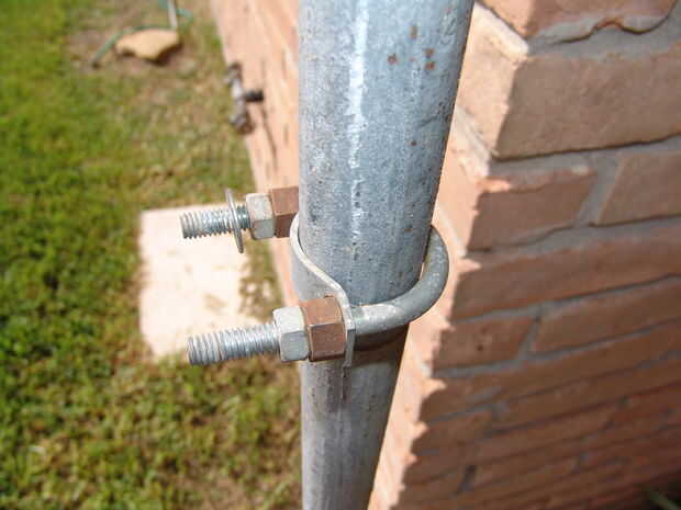 2) Apriete las tuercas de perno en u lo suficiente como para deformar la placa plana del perno en u alrededor del diámetro de la varilla de metal y luego retroceda lo suficiente como para permitir que el perno en u se coloca a mano en el poste y a girar. No dejarlas demasiado flojo como fricción un poco es buena. Tienen que ser capaces de girar y levantó a inspirarse en la manguera de carrete Cruz apoyos cuando los carretes de la manguera están atornillados para arriba.