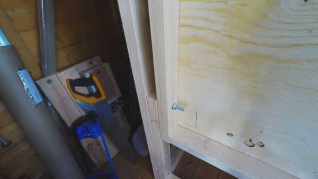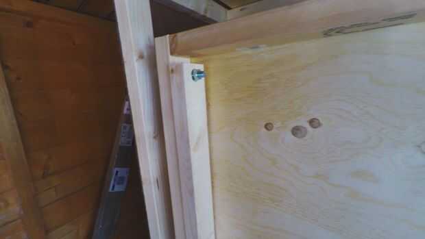Un simple trozo de CLS en la parte superior de la forma de la estructura principal un bloque de tope para que la mesa no cae totalmente en la pared. Un piecs de desecho de la madera contrachapada 18mm atado delante de la estructura puede ser torcida para detener el fallinf de la tabla hacia adelante. Iba a añadir un cierre de puerta pero este gran trabajo. La mesa se inclina hacia la estructura por lo que es casi imposible caer hacia adelante su propio.