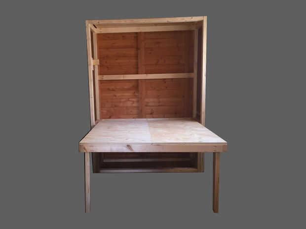 Aunque fue un proceso muy simple. He hecho la misma manera que la estructura principal. He añadido la madera contrachapada de 18mm para la tapa de tabla. Las patas delanteras están conectadas mediante el bolst 2, 2 tuercas y 4 arandelas, una arandela a cada lado de la pierna. Swinf libremente debajo de la mesa y tuck lejos cuando la tabla es vertical.