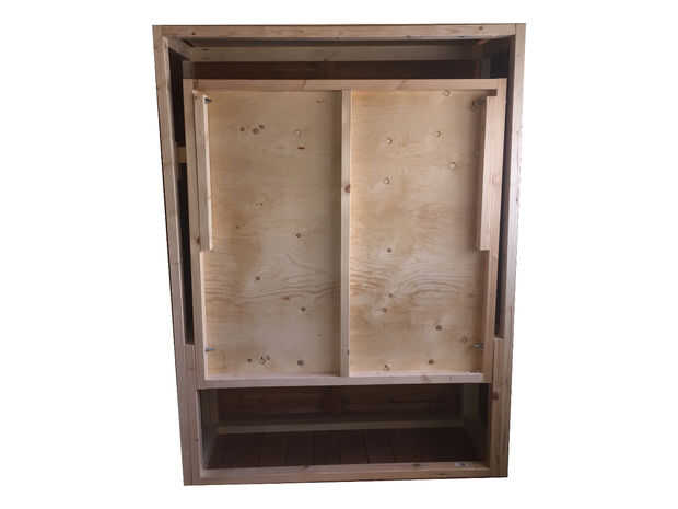 Lo último que hice fue cubierta al exterior de la doble estructura con madera dura templada que he pintado. Esto es solo para ayudar a la apariencia. Podría cubrir el exterior con algo realmente o incluso leve abrir si querías. La parte delantera recubierta de una persiana. Creo que por tener 2 puertas en el frente, pero aunque necesitarían más elAbierta habitación enfrente de la mesa así que elegí el ciego en su lugar.