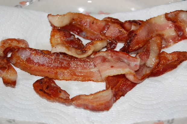 Tomar su hermoso tocino y ponerlo en una sartén.  Colocar a fuego medio y cocine hasta que bien marrón y su crujiente de oro. Retirar de la sartén y escurrir sobre un papel absorbente.