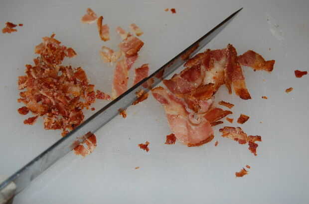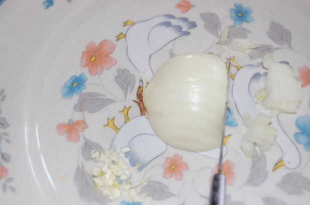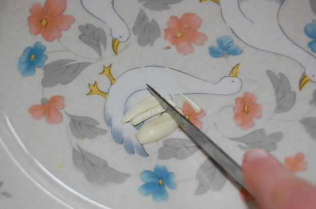 Finalmente picar el diente de ajo y cortar en cuadritos la cebolla. También cortar el tocino en trozos finos.