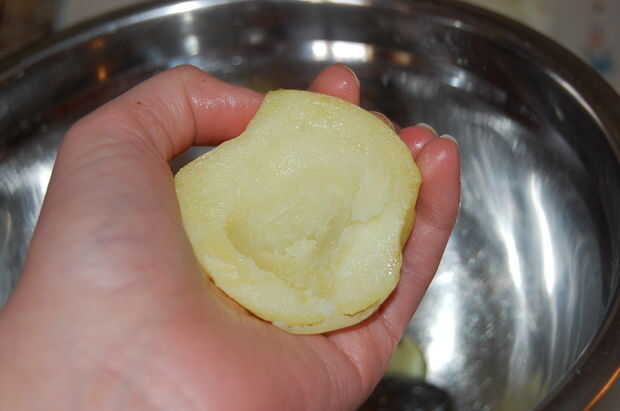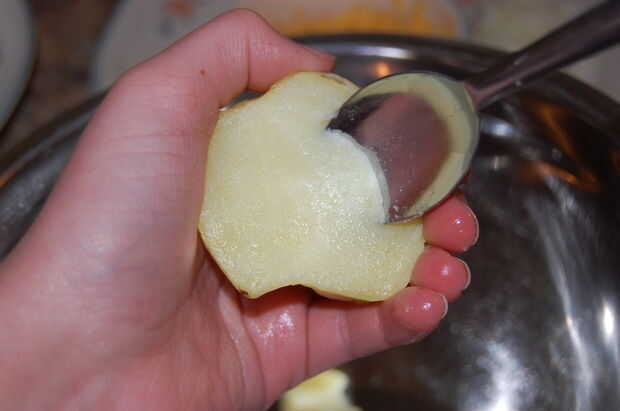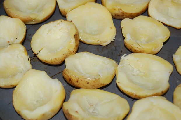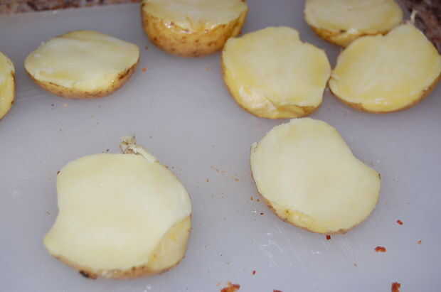 Paso 1: Limpiar y pelar patatas Pelado (opcional)Limpiar - poner bajo el grifo y lavar.Poner en papel de aluminioPaso 2: Precalentar el horno a 425 o 450. Más rápido cocinar a 450Paso 3: Rebanar papas Corte 3/4 camino abajo. Láminas entre sí. No cort