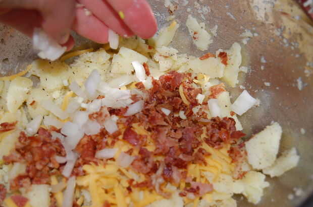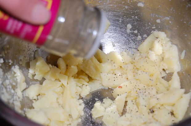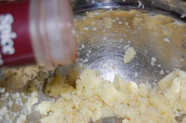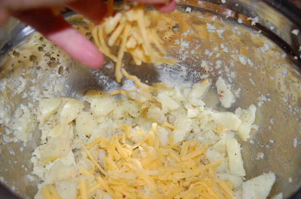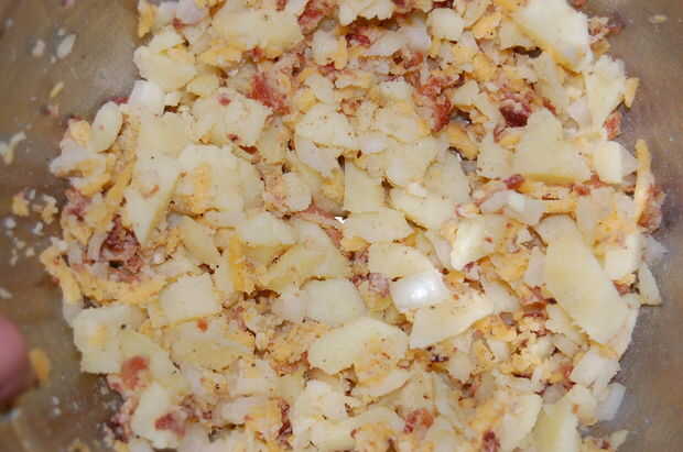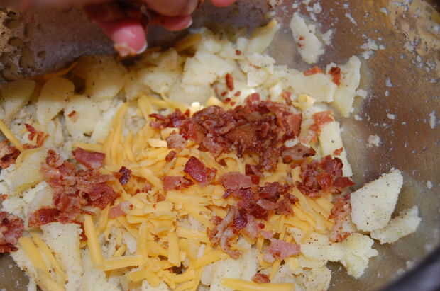 Puré encima de las patatas un poco. Agregar la crema, salvia, polvo de Chile, queso, bacon, cebolla, sal, pimienta y ajo para las patatas. (O, para decirlo simplemente, todo lo demás excepto el pan rallado)