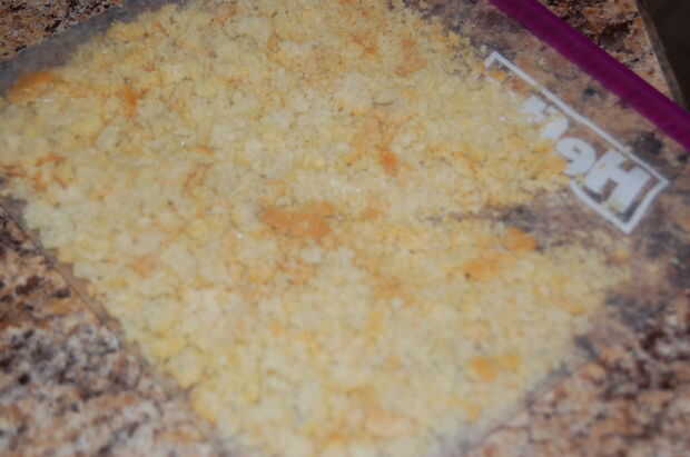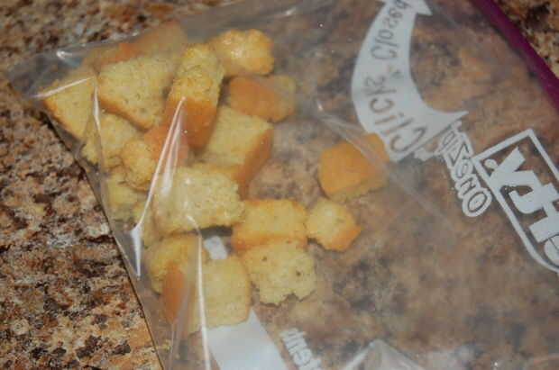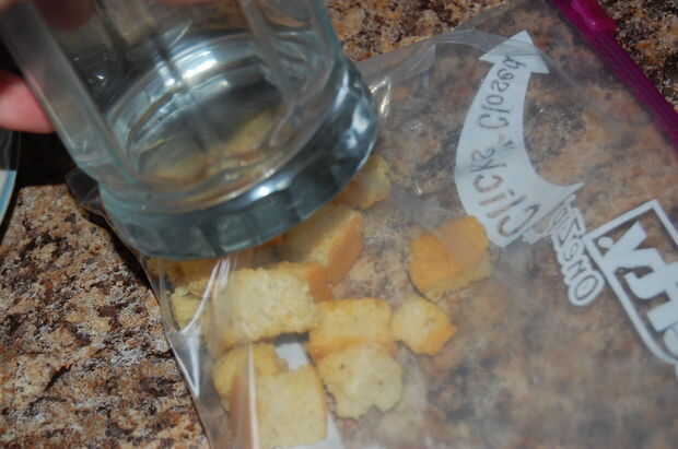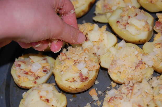 Poner sus picatostes en una bolsa de plástico y aplastarlas con un objeto pesado como una libra de carne o un vaso de agua. O, si tienes las migas extras de la parte inferior de la bolsa, simplemente omitir este paso y usarlos. Espolvorea las migas encima de las patatas. Esto les dará un buen crujido.