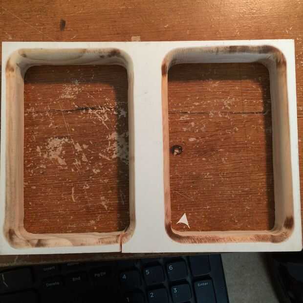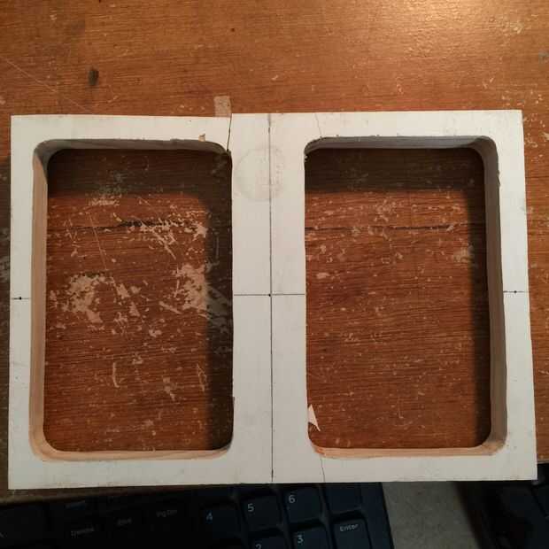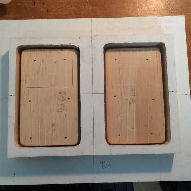 Fue de nuevo a autocad y compensar ambos los ipods en el dibujo 2, 5 mm. Lo hice porque la parte superior de la mitad de la pelota necesita para acomodar el espesor de la piel que utiliza, que era unos 2, 5 mm. Impresos y recortar la forma del ipod una vez más y localizar esta en otra pieza de pino de 3/4. Pero te recomiendo no usar pino para esto, y si lees el siguiente paso verás por qué. Utilice madera contrachapada o PE o algo que no agriete. Usé una broca que estaba cerca del radio preciso el las esquinas y corte el resto del perfil con una sierra de calar.