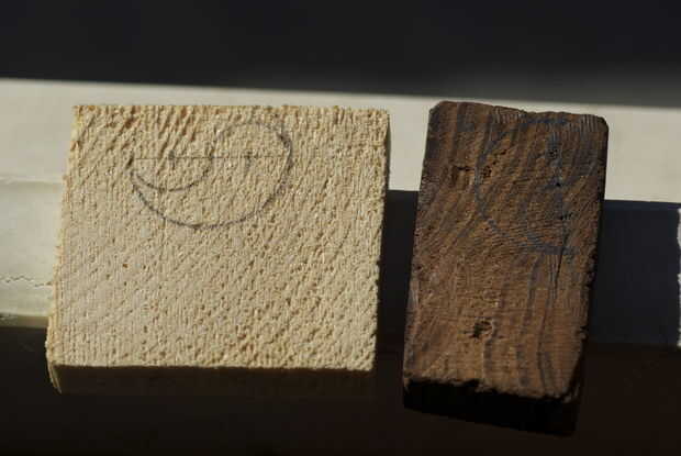 Con el compás dibujó sobre las rebanadas de los diseños deseados. No creo sobre los granos de madera pero la próxima vez que intentaría hacerlos paralelos en la pieza acabada.