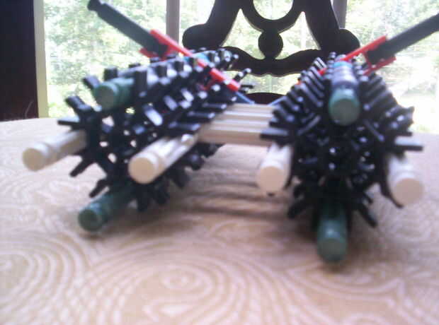 es un arma de simple KVG con desencadenar nuevos lo siento por pequeñas fotos usé mi teléfonoPaso 1: barril acaba de poner conectores rojo 11 en una barra rojaPaso 2: gatillo hacer este 2 conectores naranja sobre una barra blancaPaso 3: manejar! sin