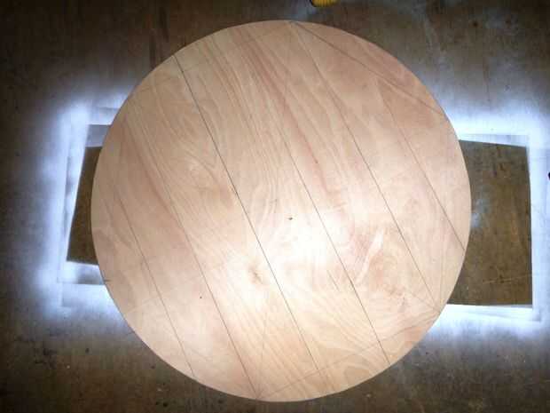 El primer paso fue marcar la mesa. Para dibujar un círculo me encontré con el centro del tablero dibujando diagonales desde las esquinas. Luego utilicé un trozo de cuerda clavado en el centro y un lápiz para dibujar un círculo. Salí de madera repuesto un poco en el lado y utilizado más adelante, pero depende de qué tamaño de la tabla le quiere.