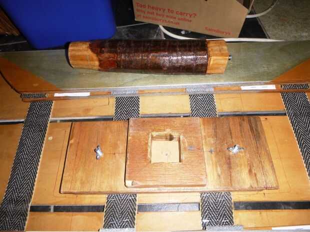 La pierna utiliza una rama de cerezo madera, cortar el extremo cuadrado que calcen bien en la toma de corriente. El fondo tuvo que forma cónica debido a la forma de las pies/patas del trípode (véase la sección siguiente). Era difícil para que todo salga de nivel pero con ensayo y error he conseguido.