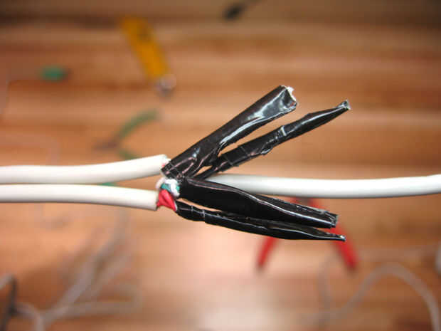 Una vez que los cuatro grupos de cables rojo, blancos, negro y verdes son juntos bien envolverlos en cinta. Cuando haya terminado debe tener un cable del estilo Y de suciedad.