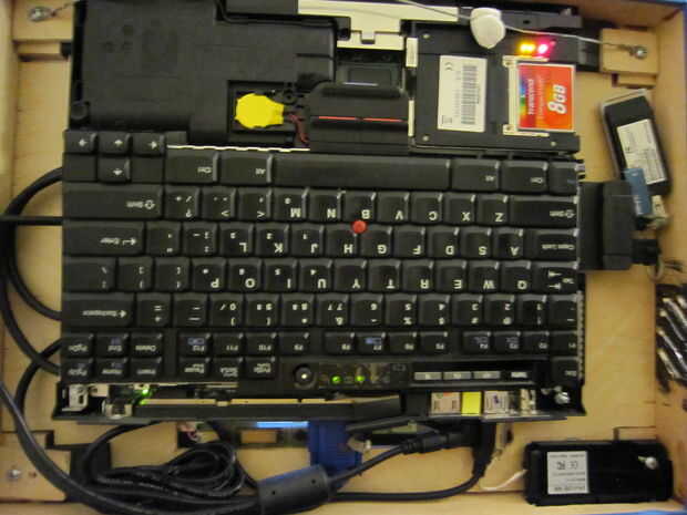 El disco duro del ordenador portátil fue malo, así que lo reemplacé con una tarjeta CF de 8GB con un adaptador del ordenador portátil. He leído todas las historias de horror de la utilización de tarjeta compact flash para un disco de sistema operativo, pero tiré la precaución al viento. Además, la unidad de CD era hosed, así que fui allí alguna idea para un sistema operativo Live CD. Me quité el plástico de la pantalla LCD y restos de la palma. Mantuve el plástico del fondo intacto para mantener el Motherboard, Tarjeta madre, ventiladores y la batería. sí, yo estoy manteniendo la batería en el portátil, en caso de apagón. Mi tech tiene batería back-ups, así que tiré la precaución al viento otra vez. Que aumentar el peso total, pero exceso de ingeniería los marcos con el peso en la mente.