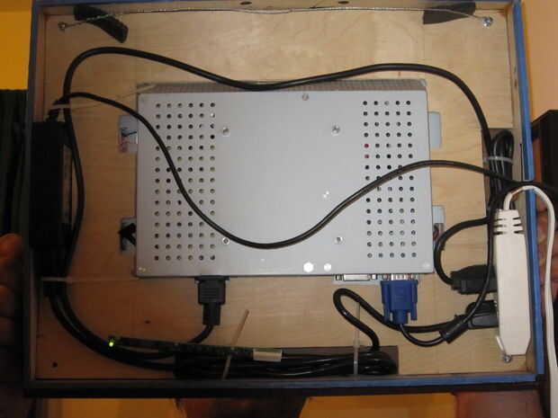Las otras casas de marco el Monitor de LCD Lenovo despojado y el adaptador de alimentación portátil. El monitor externo es 17" visible con resolución de 1280 x 1024. Tuve dos pantallas a la misma resolución de 1024 x 768. Con todos los adaptadores y tal en el marco del ordenador portátil, había poco espacio para el ladrillo de la energía del ordenador portátil. Quería minimizar la cantidad de cables colgando fuera de los marcos, así que los cables de alimentación del monitor y el adaptador de alimentación portátil enrollado y conectado a la extensión dentro del segundo marco. El cable de extensión es el único cable visible y que cuelga de los marcos de la foto. Hay dos otros cordones entre los marcos; el portátil corriente continua desde el ladrillo de la energía y el cable VGA. Ésos son invisibles desde la parte delantera y oculta entre los cuadros.