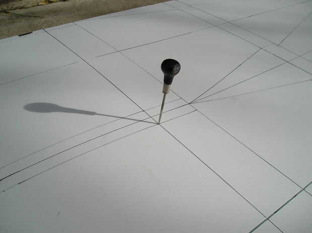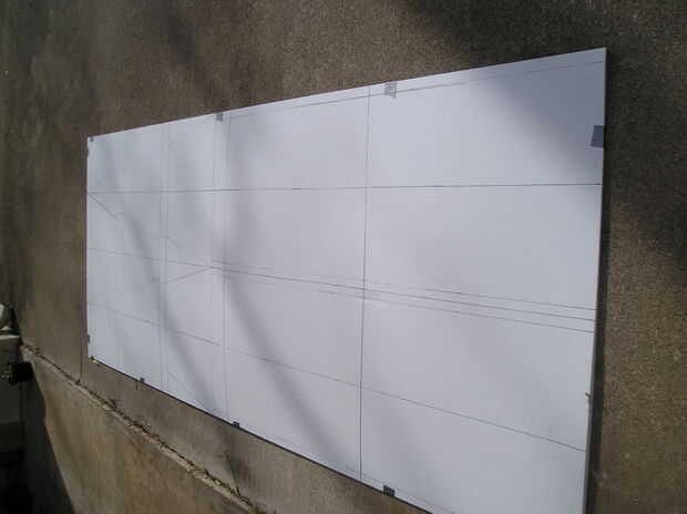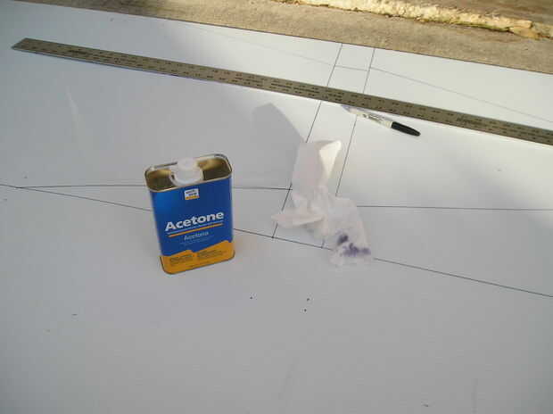 Dibujar estos patrones en las hojas de Coroplast; cuatro hojas para el modelo superior en el diagrama y uno para la parte inferior. Las hojas de Coroplast son las mismas en ambos lados, así que no importa qué lado desea dibujar sobre. Para reducir la cantidad de tedioso de medición y dibujo, he utilizado una hoja como un patrón para el resto, por apilables hojas debajo de la que ya se dibuja y los extremos exteriores de la marca con un marcador Sharpie, y el interior puntos por pegar un agujero a través de las hojas con una herramienta afilada como un punzón o clavo. Usar acetona en un trapo para borrar errores del marcador.