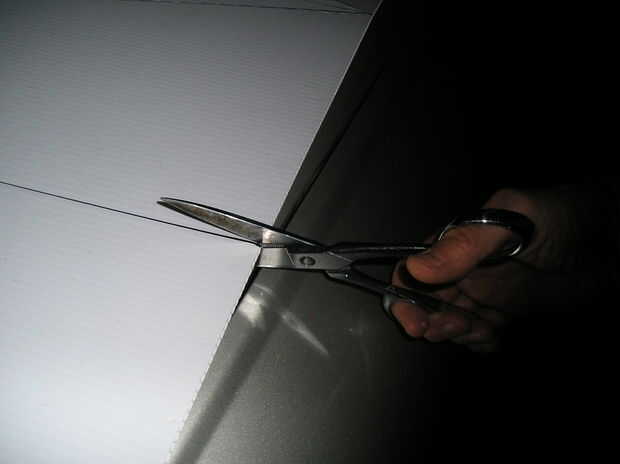 Eliminar material que no es necesario por el corte alrededor del perímetro del patrón en cada hoja del Coroplast con un cuchillo o un par de tijeras de trabajo pesado.  Si utiliza el cuchillo para uso general, puede ser útil poner un pedazo de material de desecho o cartón bajo la pieza a cortar.
