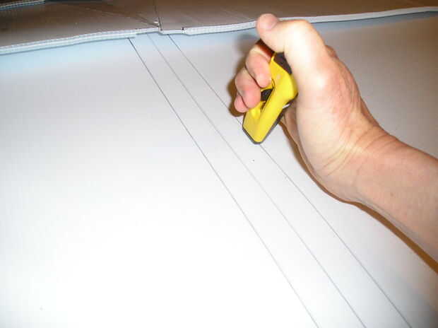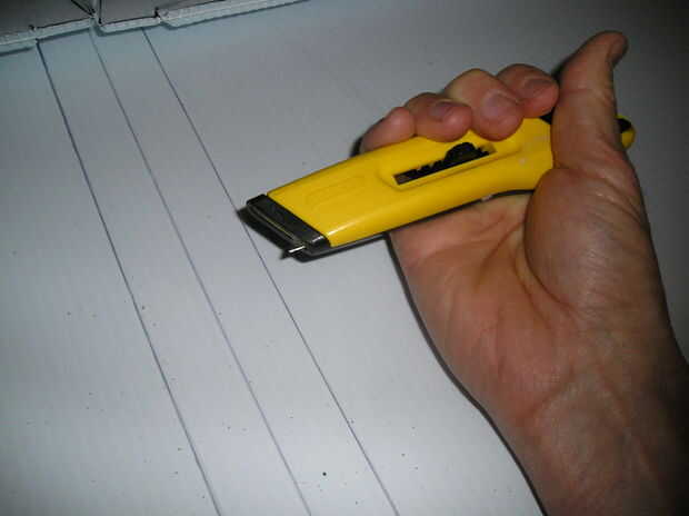 Puntuación las hojas facilita su doble a lo largo de líneas rectas. Puntuación, me refiero a cortar la primera capa de un lado, dejando intacto el lado opuesto. Ajustar la cuchilla de utilidad a una profundidad de unos 2mm. Hacer cortes en material de desecho para la práctica y ver cómo profundamente el corte tiene que ser para una buena curva en el material de prueba. La regla de metal ayuda como guía al cortar en diagonal a través de la hoja. También es importantes la orientación de la regla con respecto a la corte y las nervaduras internas del Coroplast. Una orientación empuja la hoja contra la regla (bueno); la otra orientación empuja la hoja de la regla (malo). Experimento para encontrar el método que funciona mejor para usted.