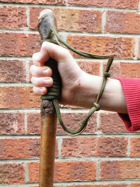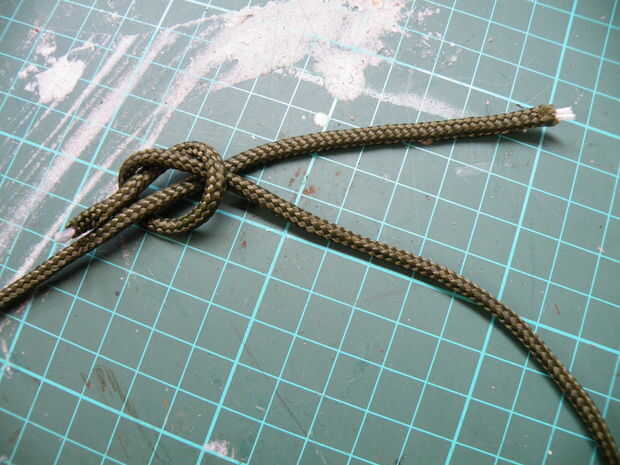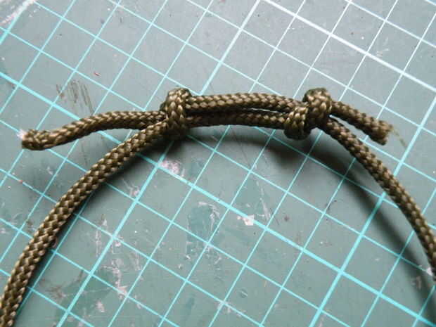Me estaba haciendo esto por mi hijo menor utilizar como cables de un bastón cuando él sale con su abuelo en Semana Santa - había un vistazo a nuestros libros de nudo y pidió un nudo pescador, que a menudo se utiliza para hacer el collar ajustable. No el mejor nudo para atar en paracord suave, parece que funciona bastante bien cuando está atado dos cuerdas a la vez - debe ser la fricción adicional con dos cables en un nudo.