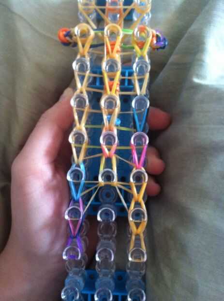 A partir de los pies ir debajo de todas las bandas a las bandas inferior 2 y telar para arriba. Seguir todo el camino hasta los brazos y el cuello. Telar de izquierda a derecha para todas las filas de 3. debería verse como se muestra.