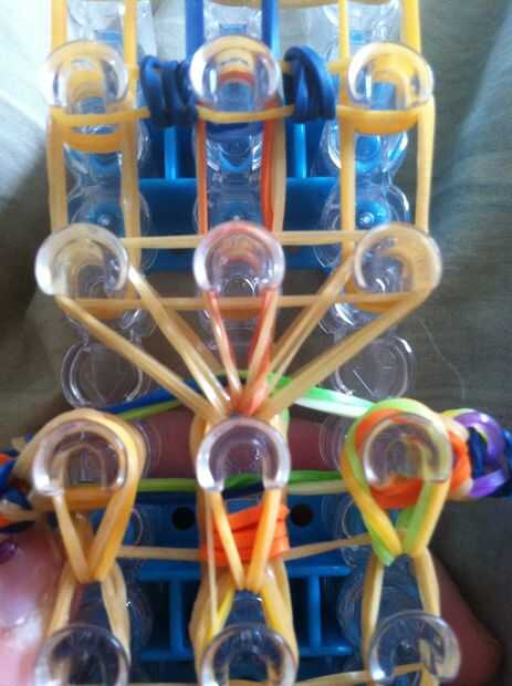 Se trata de la parte más difícil. La clavija media del cuello, será estás ahora estamos que se avecina. Pasar por debajo de todas las bandas hasta encontrar las 2 bandas que pertenecen a la izquierda de las bandas de cabezas. Tire de ellas a través de todas las bandas y lazo en la clavija inclinada sobre ella. Repita estos pasos en las otras 2 clavijas. Debe hacer una lágrima caer de forma si han agarrado las bandas correctas. Debería verse como se muestra.