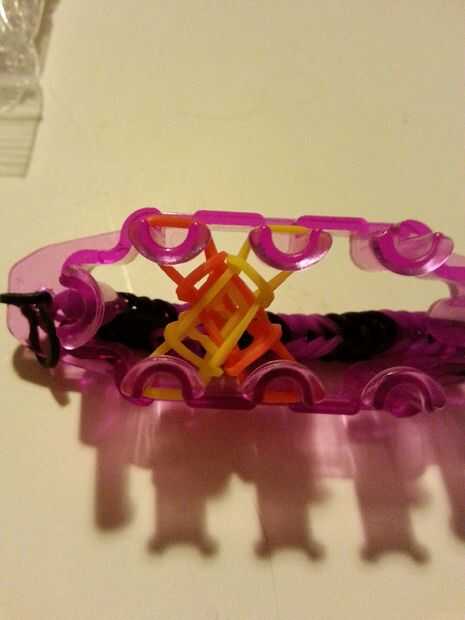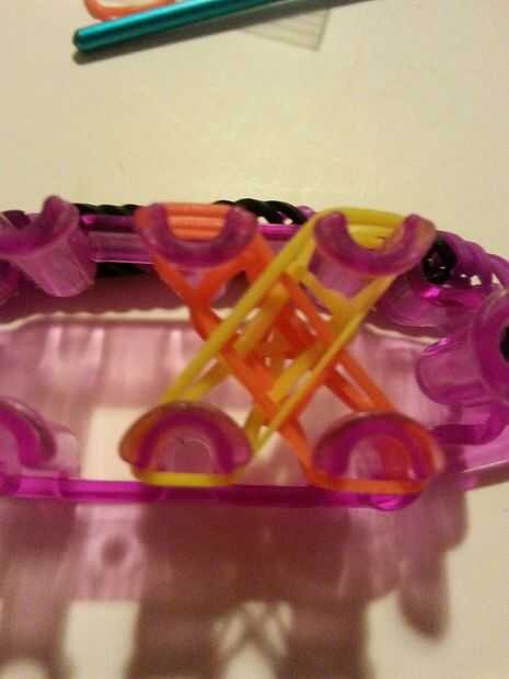 Pulsera única de telar del arco irisPaso 1:Coloque una banda roja en el telar.Paso 2:Luego, colocar una banda amarilla en la dirección opuesta.Paso 3:Continuar ese proceso en el orden del color del arco iris. Pare en el color de rosa.Paso 4:Luego agr
