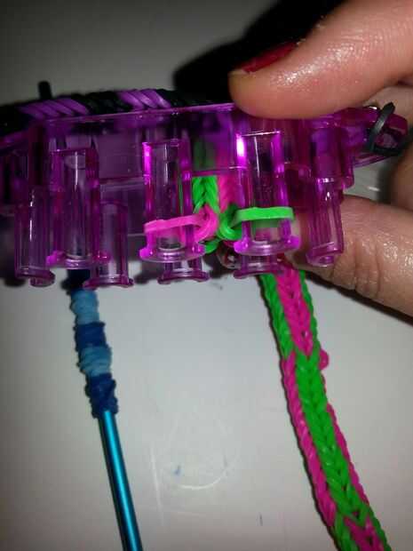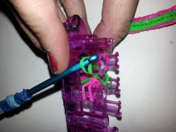 Al llegar a la longitud que desee, poniendo la banda tercera parada en materia de ahora usted tendrá sólo dos en cada clavija. Ahora toma la banda inferior en la clavija superior (Foto 2) y llevarlo encima. Hacer lo mismo con el derecho al lado de él. (Fig 4-5) Ahora tome el single de la banda han dejado en cada clavija y poner el abajo en el peg justo debajo de él. Hacer lo mismo con la otra banda sola. Su proyecto debe parecerse a mi (foto 6-7) ahora tienes tres bandas en dos clavijas, necesita tomar la banda inferior, llevarla encima en el centro, mismo con el otro. Hacer esto otra vez hasta que sólo una banda en cada una de las dos clavijas. (Foto 8)