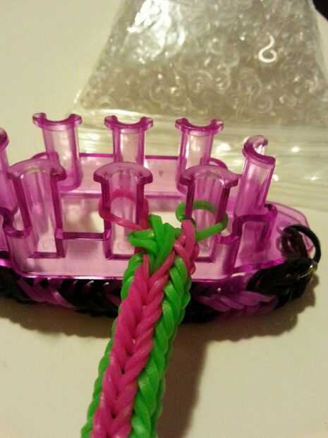 Pulsera única de telar del arco irisPaso 1:Coloque una banda roja en el telar.Paso 2:Luego, colocar una banda amarilla en la dirección opuesta.Paso 3:Continuar ese proceso en el orden del color del arco iris. Pare en el color de rosa.Paso 4:Luego agr