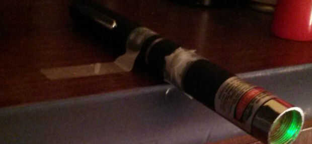 Cinta el botón el puntero láser hacia abajo para que la luz nunca se apaga. Ahora encontrar una superficie plana que tiene una visión clara de la pared. Ahora con cinta adhesiva el láser a la superficie plana para que el láser golpea la pared. Ya que el láser puede ser en un rato mientras jugar y preparar, puede que necesite cambiar periódicamente las pilas en el láser.