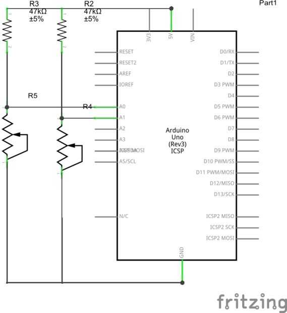 Dos sensores de flexión se conectan como un circuito divisor de tensión
