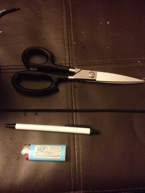 Para esta pulsera se necesitan 15 pies de Paracord (sobre un pie y medio en una pulgada), tijeras, un encendedor, una pluma y un mosquetón (o en este caso un llavero de resorte de cierre).