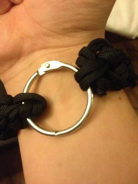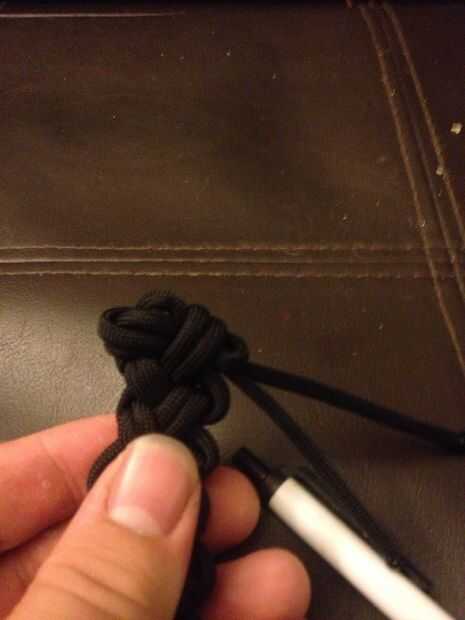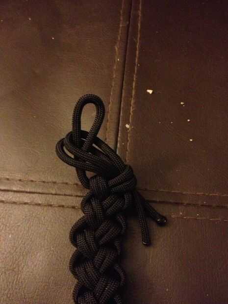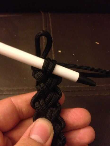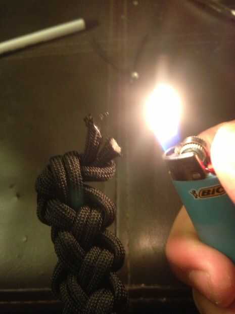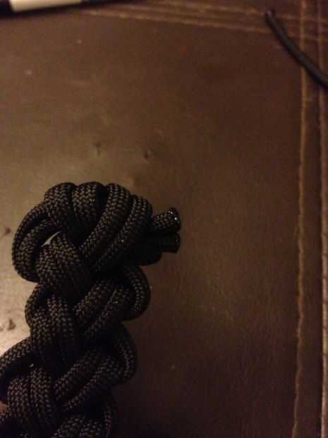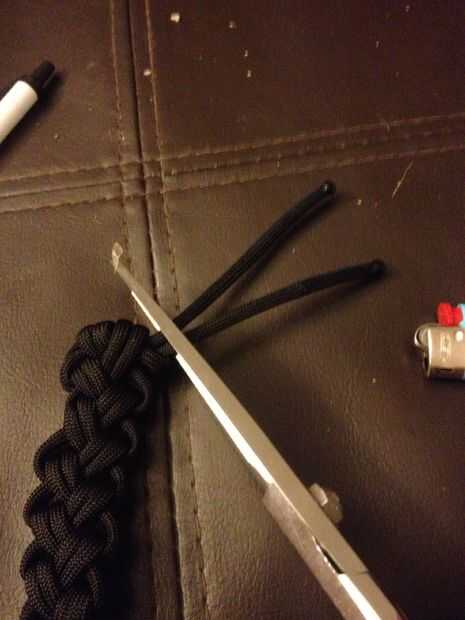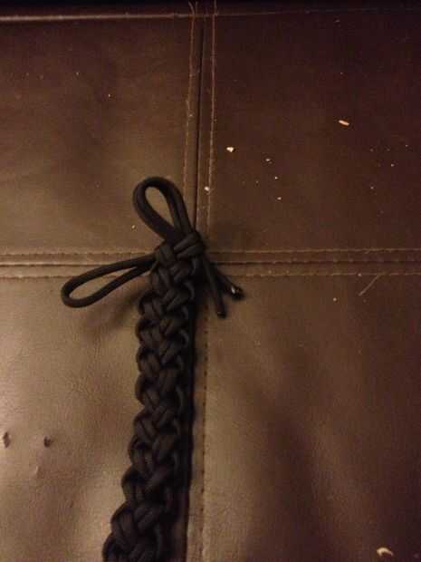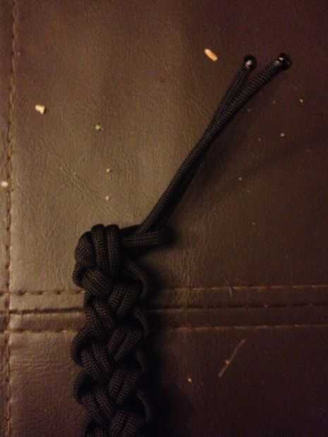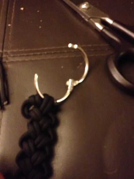 Tomar el lado izquierdo y tire de ella a través del lazo de derecha y apriete. Esto su trenza en lugar de la cerradura y que impidan deshacer. Tomar el lápiz y empújelo a través del primer lazo abajo a la derecha; Esto ensancha la abertura para que pueda deslizar el cable de la izquierda a través de. Una vez que han tirado del lado izquierdo Empuje el lado derecho a través del lazo a la izquierda por la derecha. Cortar, quemar y apriete. Ahora empuje el mosquetón (o tecla en este caso, anillo) a través del lazo superior y listo! La pulsera es completa. Para sujetar, apretar el mosquetón a través del lazo en el otro extremo de la pulsera.
