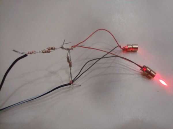 La mala noticia es que no tengo los valores exactos de resistencias, pero mediante la combinación de resistencias de 4 pudo finalmente llegar a un circuito que no se calienta cuando las luces láser.
