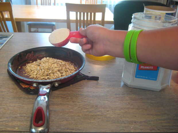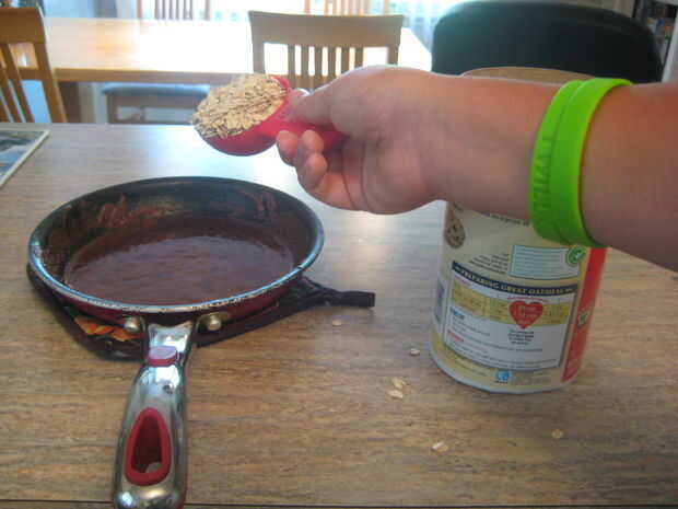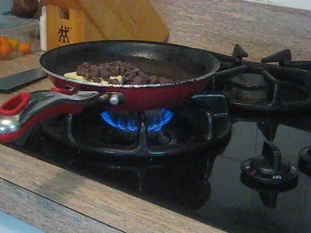 Engrase una tartera circular, mina es de 10 pulgadas. En una sartén derretir los trozos de chocolate y la mantequilla a fuego bajo. A continuación mezclar la avena, el azúcar y la harina. Presionar esta mezcla en el molde de tarta, cubrir el fondo y los lados con ella. Hornear en un horno de 350 grados durante 8-10 minutos.