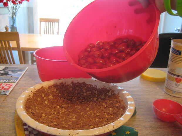 Cuando la corteza se hornea combinan las cerezas, el relleno de pastel de cereza y el extracto de almendra. Vierta esto en la corteza.