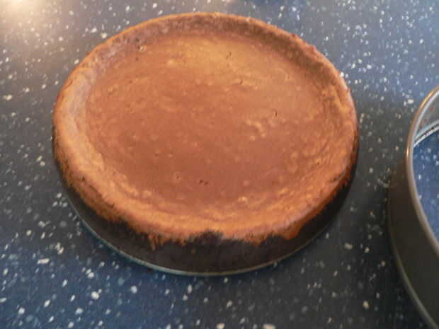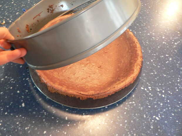 Quitar tu tarta de queso de la nevera y sacar los lados de la asadera. Puede tener hundido uniformemente alrededor de los bordes pero de queso casi todas que he hecho hacer esto. Confía en mí, esto es bueno- hace por un trozo de pastel hermoso una vez que pones este ganache fabuloso en. ¡ Verás! :-)
