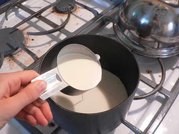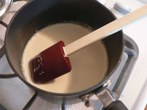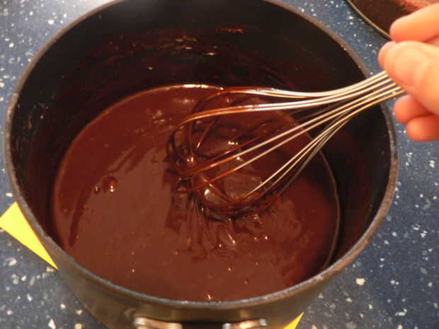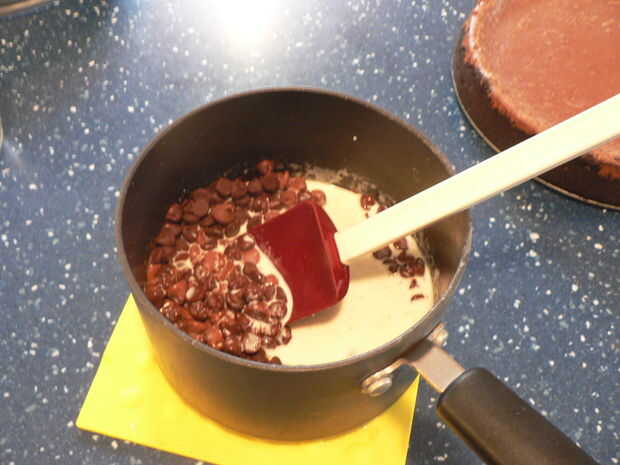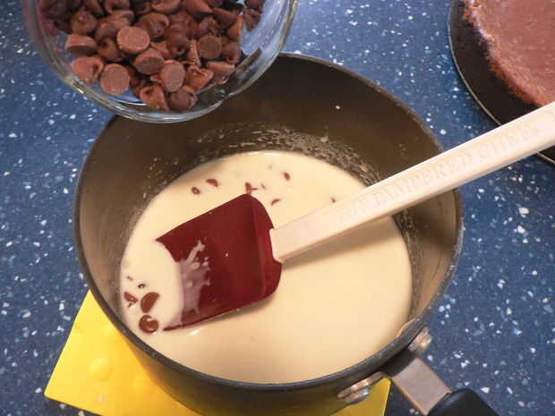 Vierta su 3/4 taza de crema para batir en una cacerola en la estufa y llevar a hervir sobre fuego medio alto. Retirar del fuego y agregue los trocitos de chocolate. Mantener revolviendo y ya que viene juntos, cambiar a su bate, revolviendo hasta que se combina totalmente y Smoot como la seda. Deje que esta se enfríe un poco.